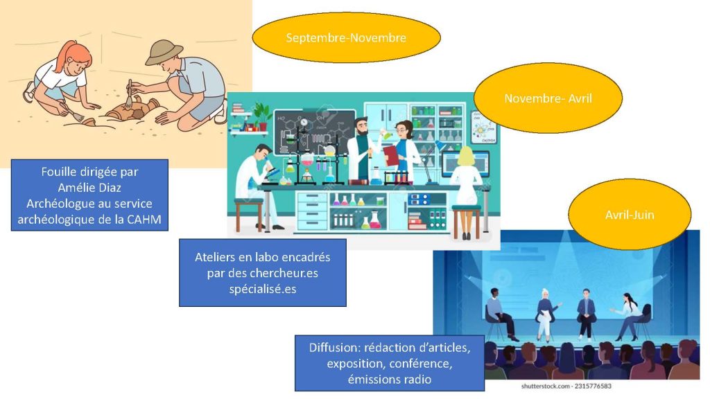 Découvrir des méthodes scientifiques en les pratiquant dans le cadre d'une projet de fouille archéologique. Découvrir des métiers qui collaborent dans un projet scientifique au contact es spécialistes qui encadreront des ateliers. Développer des talents et acquérir de nouvelles compétences autour d'un projet de recherche et de communication des découvertes.