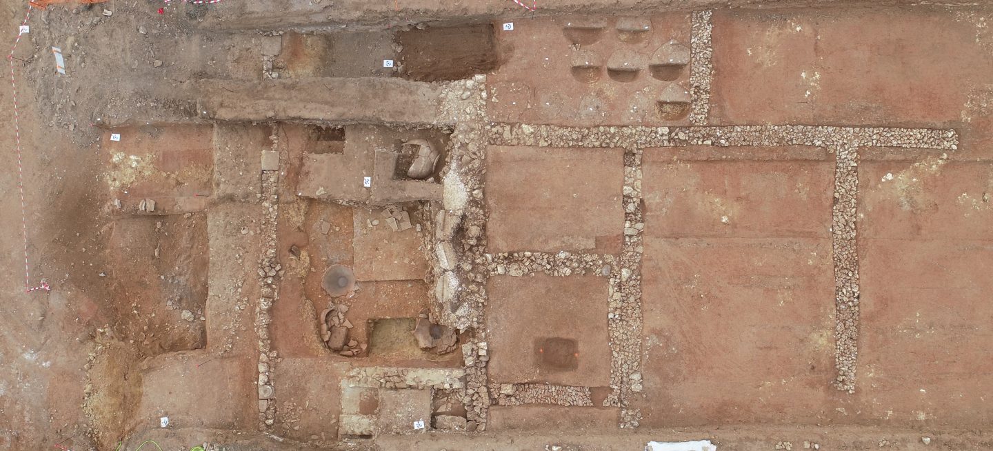 La fouille réalisée en septembre et octobre 2019 a été menée dans le cadre du projet d’aménagement Aqua Domitia, Maillon T3, Phase 1 (fig.1). Le site se trouve en rive gauche de l’Hérault, à environ 1200 m de son cours actuel. Le terrain présente une légère déclivité (entre 12 et 16 m NGF) et les parcelles concernées rejoignent, vers l’ouest, un dénivelé marqué qui surplombe la plaine d’inondation. Vers le nord et l’est, ces terrains couvrent une centaine d’hectares et sont bordés par les collines de l’Éocène moyen s’étendant entre Castelnau-de-Guers et Saint-Apolis (75 m NGF). Sur les 1500 m2 décapés (12,5 x 120 m), les vestiges sont apparus très dégradés compte tenu d’importants sous-solages et du remembrement du terrain en terrasses (fig.2).
